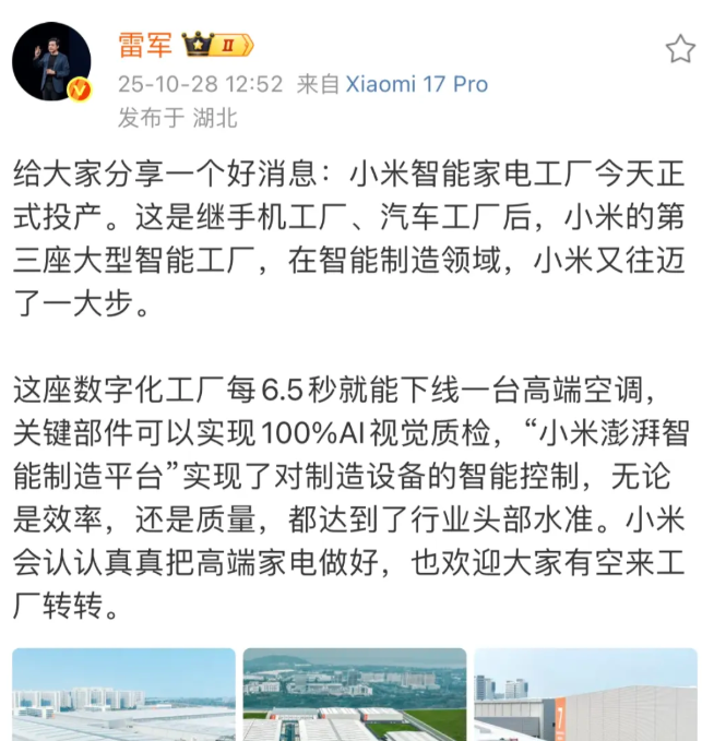 大概是小米第三座智能制造工厂,首座大家电工厂正式竣工投产,雷军也在社交媒体上宣布,小米智能家电工厂今天正式投产。这是继手机工厂、汽车工厂后,小米的第三座大型智能工厂,在智能制造领域,小米又往前迈了一大步。