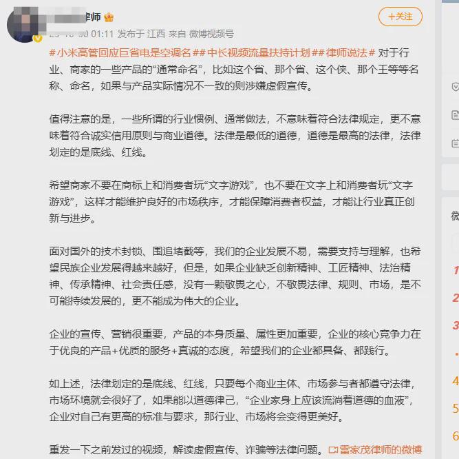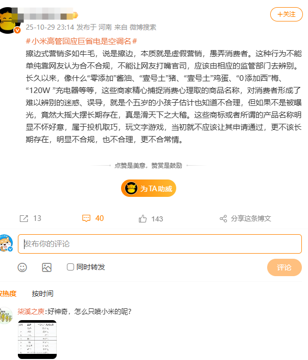 而网友们,也对此提出不一样的看法,有网友表示:名称需结合实际性能判断。小米“巨省电”系列能效数据高于国标,且行业普遍采用类似命名,不应单独苛责小米。