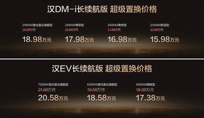 汉DM-i长续航版共推出四个版本,售价16.98-19.98万元;汉EV长续航版共推出三个版本,售价18.38-21.58万元,均提供1万元的置换优惠。